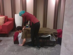 当日は、実際にお店のセラピストの方々がバーバンクまでお越しくださり、ラウンジにはマッサージチェアや施術台が登場。